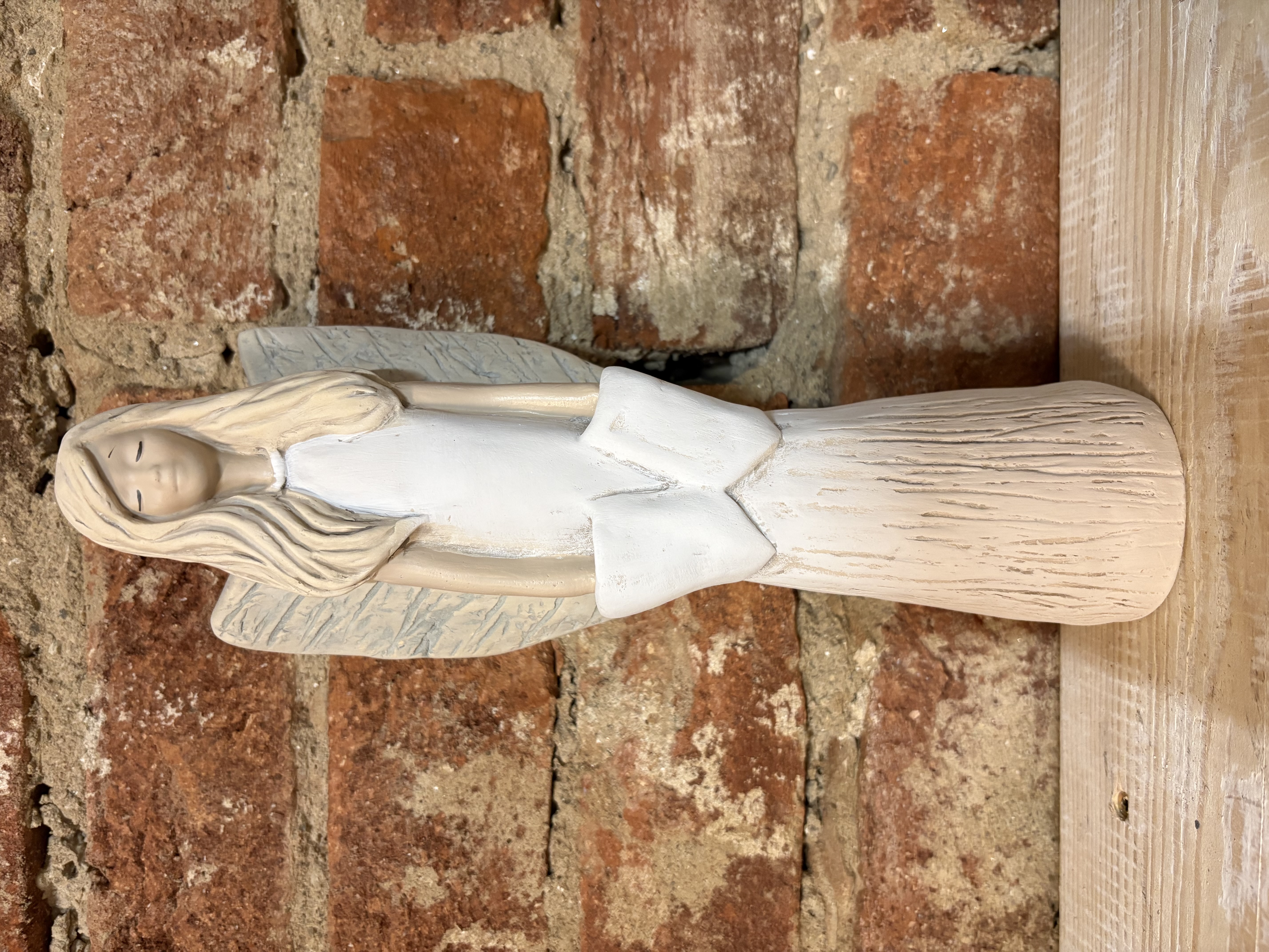 Anděl je vyroben z tvrzené sádry a ručně malovaný.