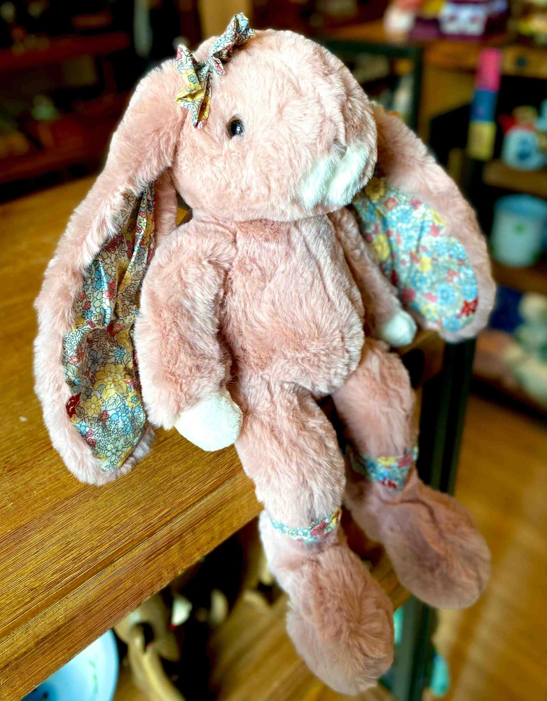 Její něžný vzhled podtrhuje drobná mašlička s květinovým motivem, která jí dodává kouzelný, hravý detail. Vnitřní strana oušek je navíc zdobená stejným květinovým vzorem, díky čemuž působí zaječice ještě něžněji.